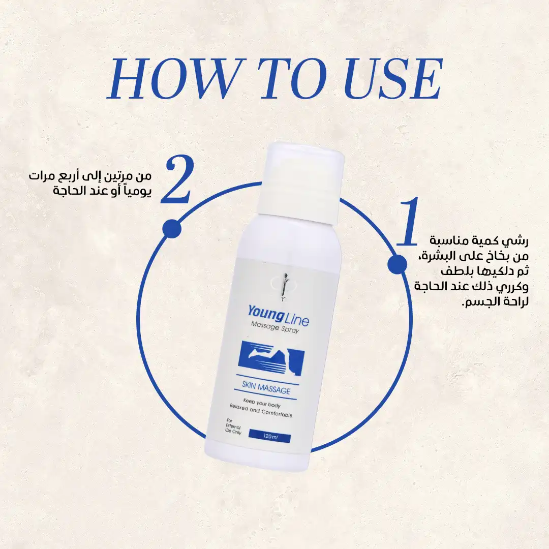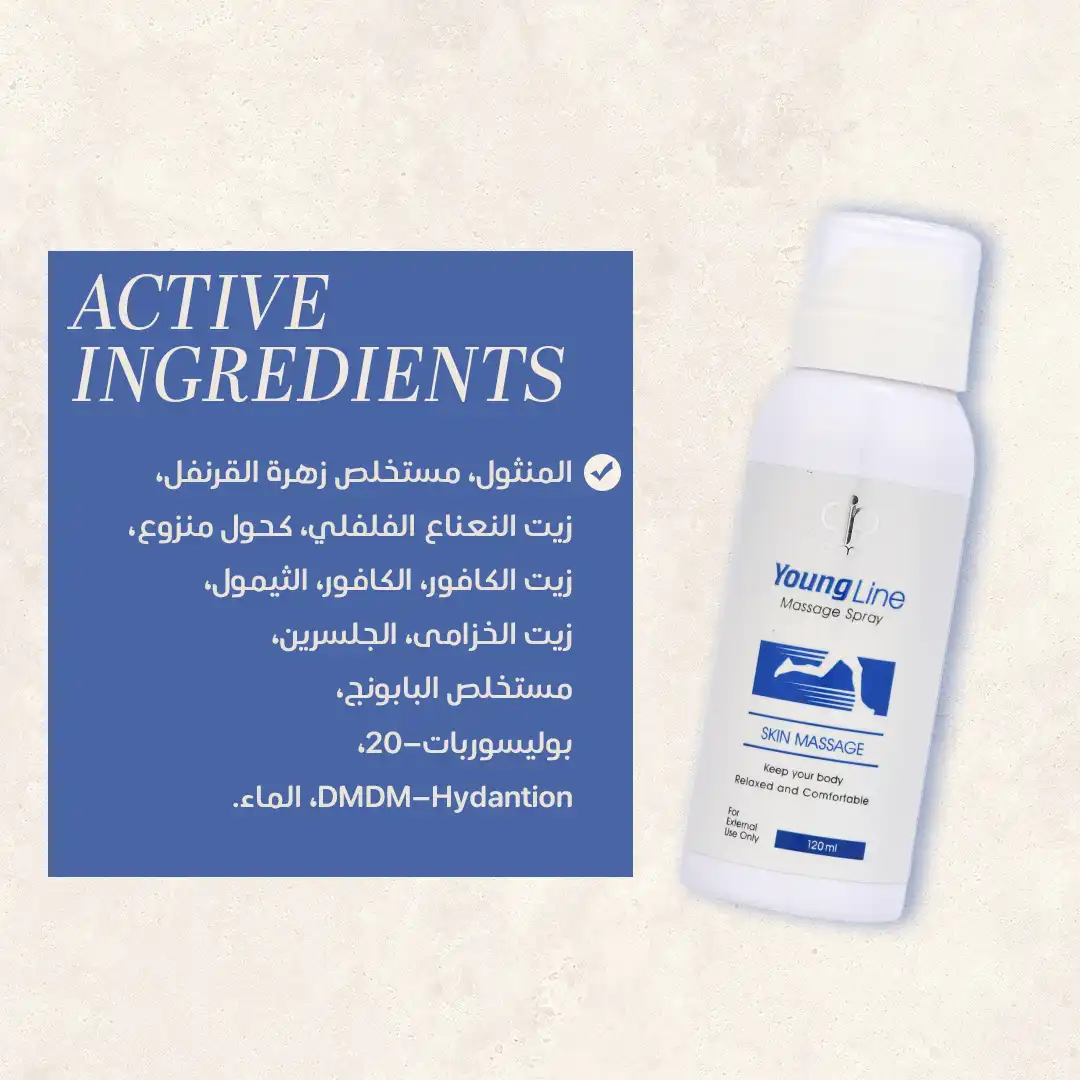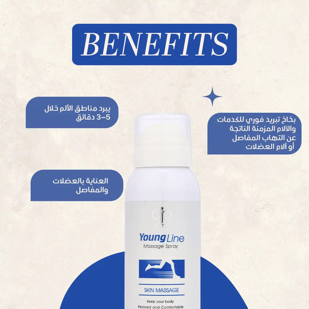 - Young line مساج سبراي ملطف للجلد ومهدئ فوري للكدمات والآلام المزمنة الناجمة عن التهاب المفاصل أو العضلات